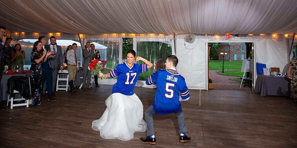 Another one of our favorite looks came from a Buffalo Bills-loving couple, Kelsey and Brendan, who entered their reception decked out in jerseys. The smiles on everyone’s faces left no doubts – their choice of outfit was super on par with their personalities!
