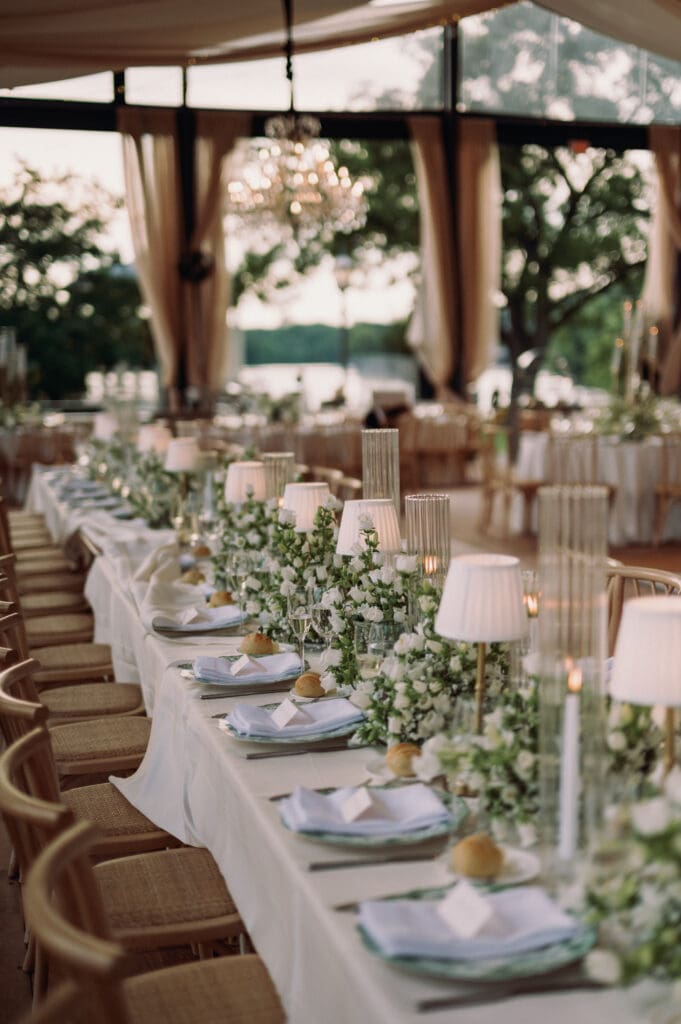 2025 leaned romantic, and we were here for it. Let us paint a picture for you: Long banquet tables. Lush floral runners. Soft‑glow lamps sprinkled throughout. Period.